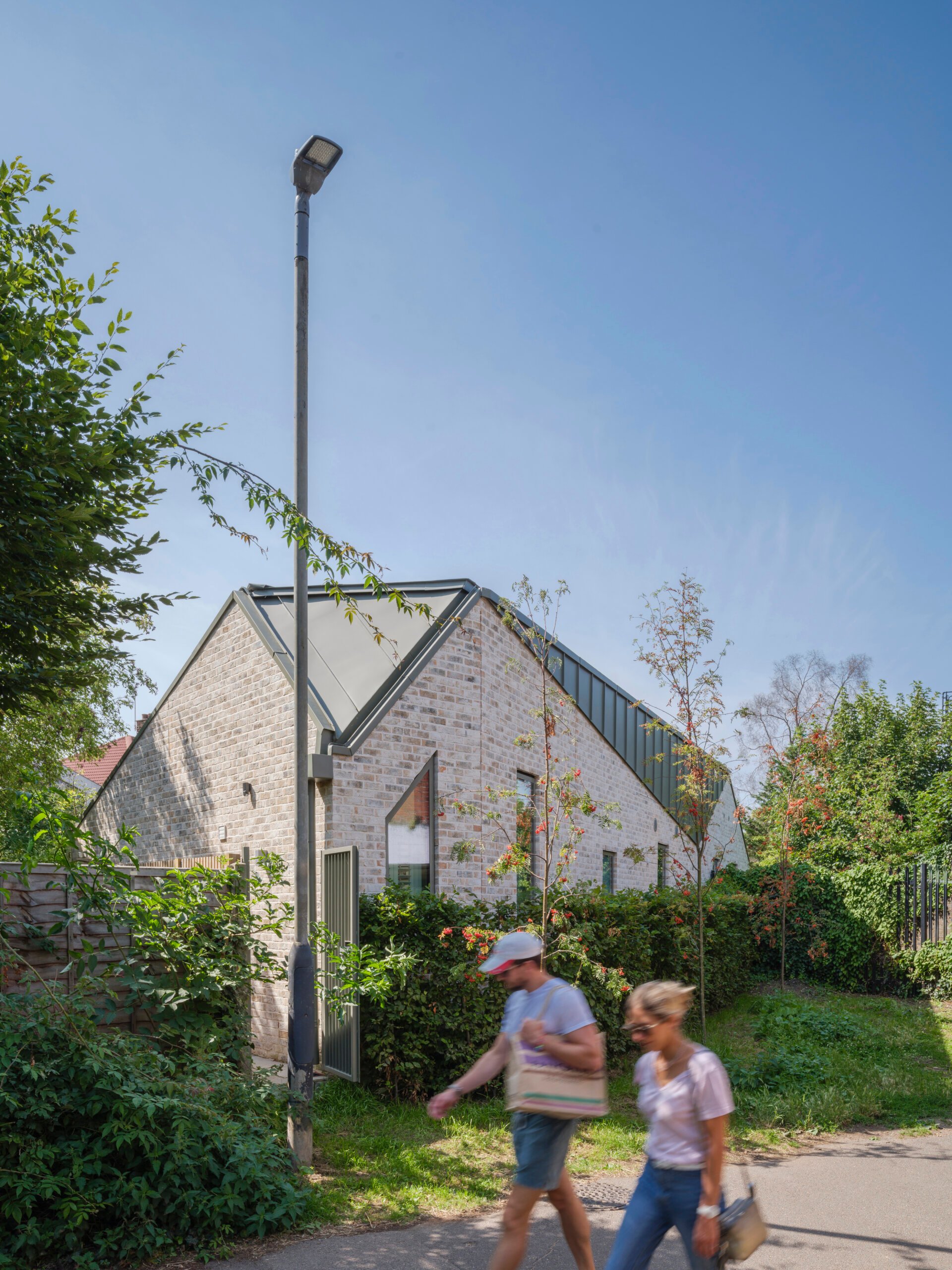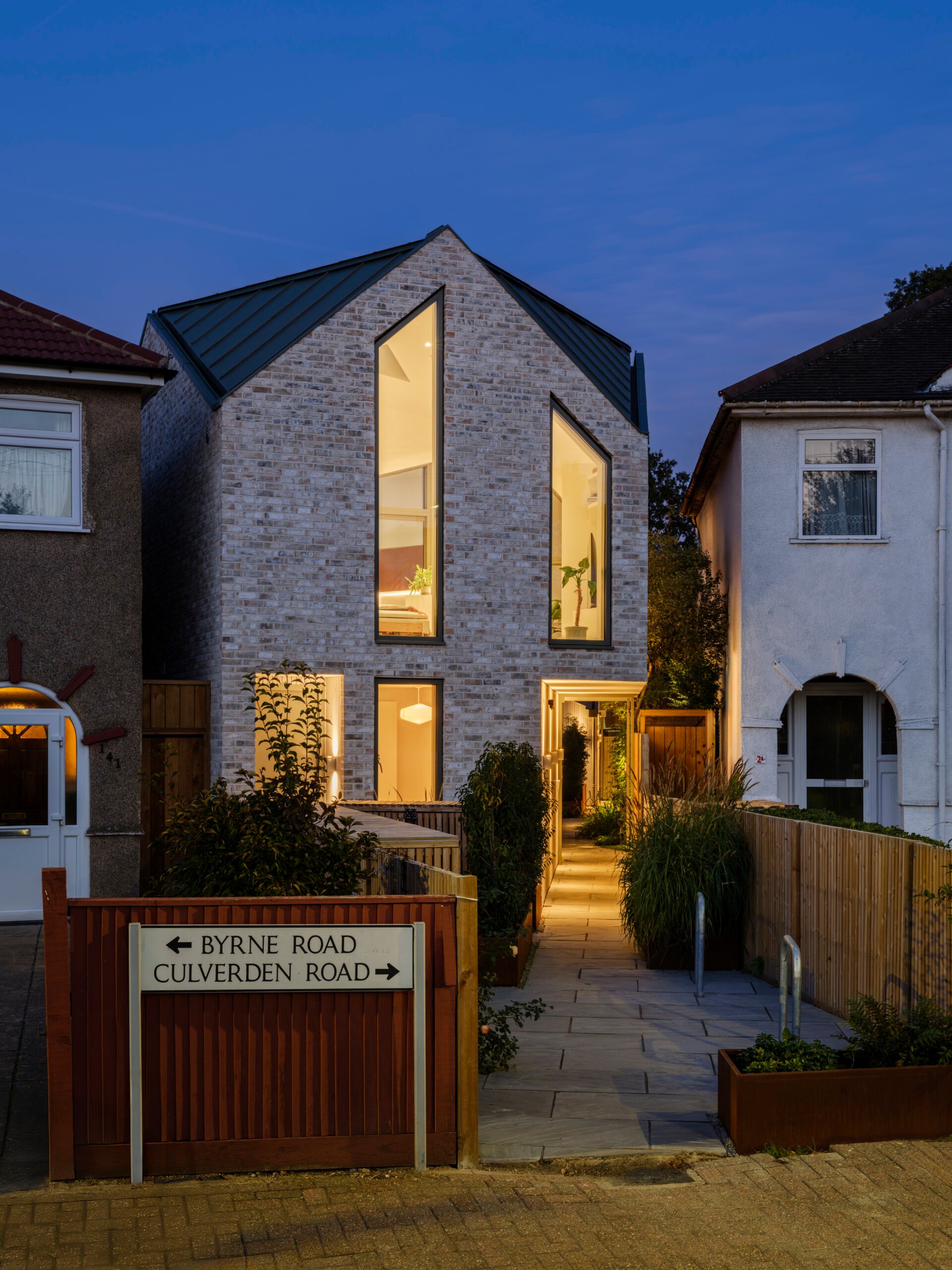 Inside, the glazing enhances every space. Bedrooms open directly onto private outdoor areas, while the main living and kitchen zones benefit from dramatic rooflines and expansive glass façades that maximise daylight throughout the day. In the evening, the home transforms, with warm interior lighting highlighting the structure and creating a welcoming presence from the outside.
